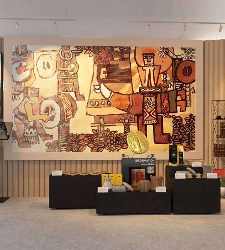 The creative team are people who love and are passionate about coffee, the land and people of the Central Highlands, have accompanied CEO Le Hoang Diep Thao for more than 20 years, led, winged ideas and dreams, created opportunity and inspire the group to make this picture. We do it with passion, respect, love, gratitude to the homeland, the land and people of the Central Highlands and especially King Coffee CEO Le Hoang Diep Thao. We want to bring the quintessence, cultural identity, wisdom, history of the land and people of Vietnam to international friends. Please share the meaning, story and message of the picture, Millions of years ago, volcanic eruptions created the legendary red basalt tropics suitable for Robusta coffee, and today the quality of Vietnamese Robusta coffee is certified as the best in the world. On that land, with more than 44 ethnic groups living for a long time, their history, culture, customs, rituals, and spirituality have created precious cultural heritages of the nation. The main picture is the reproduction of the unique cultural space of the Central Highlands: That is the image of the Central Highlands Gong festival recognized by UNECO as the Intangible Cultural Heritage of the country, with the face of the gong and drum being coffee beans, like a wish to be resounded and resounded forever. Image of Rong Tay Nguyen house – this is the house of the most powerful, prestigious, and wealthy person in the village with dedication and community values, with the roof top being the image of coffee beans as desired. Reaching new heights of Vietnamese coffee’s position in the international arena The image of matriarchy is the source, foundation, center, and harmony of yin and yang in the whole universe. In the context of the painting appearing in DuBai, a woman’s aspiration surpasses conventional rules, which is the aspiration for the role of a woman in domestic and foreign affairs, creating the future in the new era.. The image of going upstream with the great desire of Dam San to find and conquer the sun goddess to bring light to the village, Images of brocade patterns and architecture can wine bottles, baskets on the fields of the people, festival trees, looming in the sunlight, far and near the green coffee gardens and flowers, are planted under long houses, coffee is the foundation, the reason of life, the work, the dream of the crop… it is the coffee tree that has brought economic values associated with the lives of the people in this land… All, all blend and turn on the aspirational message about the Power of the value of Vietnamese Robusta coffee beans. That is also the image of the vision, thought, spirit, burning and unique aspirations of the founder CEO Le Hoang Diep Thao for King Coffee brand – Vietnamese coffee conquers the world Please borrow the idea of Writer Nguyen Ngoc writing about Jacque Dournes to close our sharing. Jacque Dournes is a French priest, one of the best, most dedicated and passionate Central Highlands scholars who, after 25 years of passionately living in the Central Highlands, sticking like a second homeland, won the whole life. his life for the Central Highlands, he wrote that If you must understand in order to love, you must love in order to understand (Jacque Dournes .) Perhaps this is also an invitation to visitors to the Red Basalt land, the land of the Black and Gold Capital of the Central Highlands with the legendary and attracti